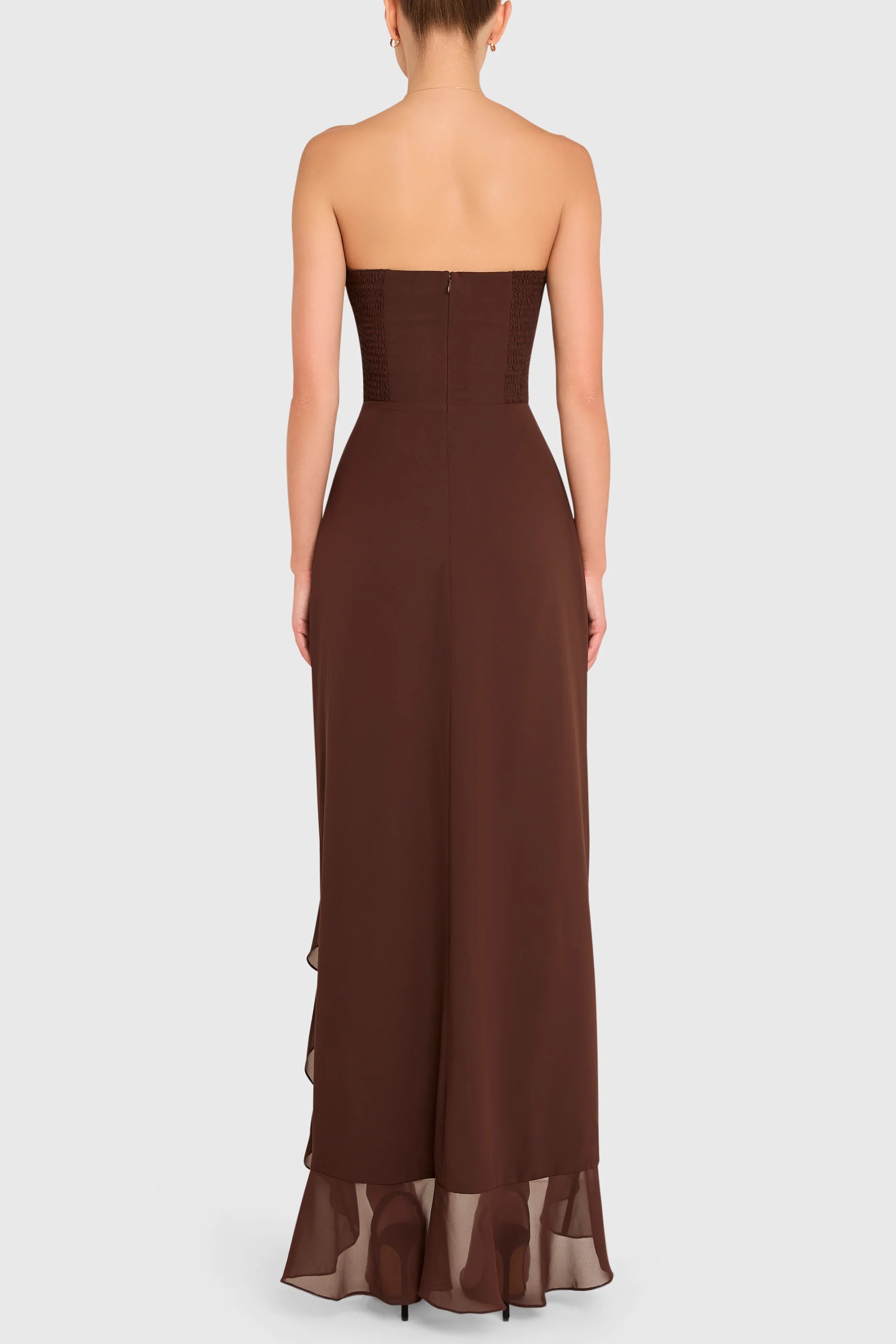 Make an entrance in the Eden Gown. This strapless design features a sweetheart neckline and a ruffled asymmetrical hem for a dramatic finish. Add a pop of color with bold heels or a statement clutch for your next special occasion.